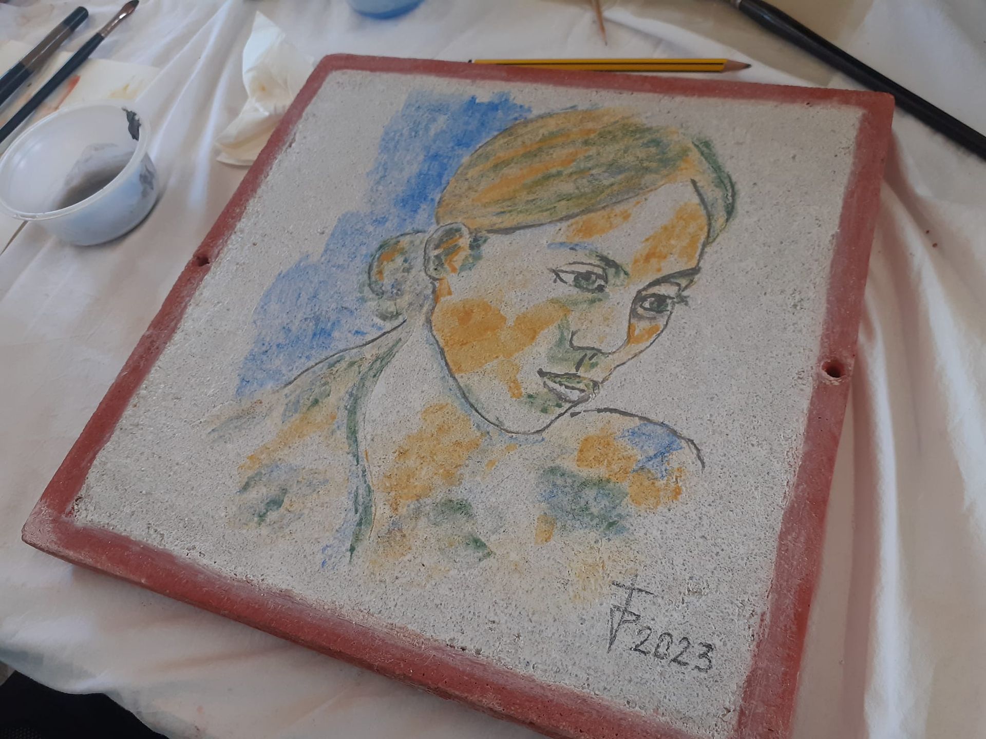 Ce mortier préparé à grands coups de truelle, est ensuite réparti dans un cadre rouge en béton respirant de 30 cm sur 30 cm, puis on le laisse sécher. Pendant ce temps tous les artistes du jour affinent leur projet de dessin avant de le décalquer sur un film plastique à l’aide d’un feutre indélébile avant de le graver sur l’enduit séché grâce à un stylet en bois.